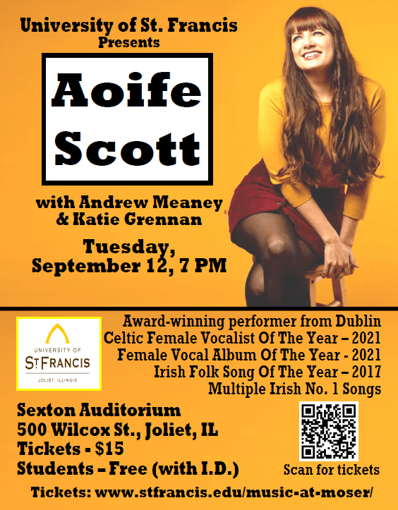 Joliet, Ill. – The University of St. Francis (USF) welcomes vocalist and performer Aoife Scott with Andrew Meaney and Katie Grennan for a concert on Tuesday, September 12, at 7 p.m. as part of the University’s Music at Moser series. The concert will take place in the Sexton Auditorium, which is located on the University’s main campus in Joliet (500 Wilcox Street, Joliet, Ill., 60435).