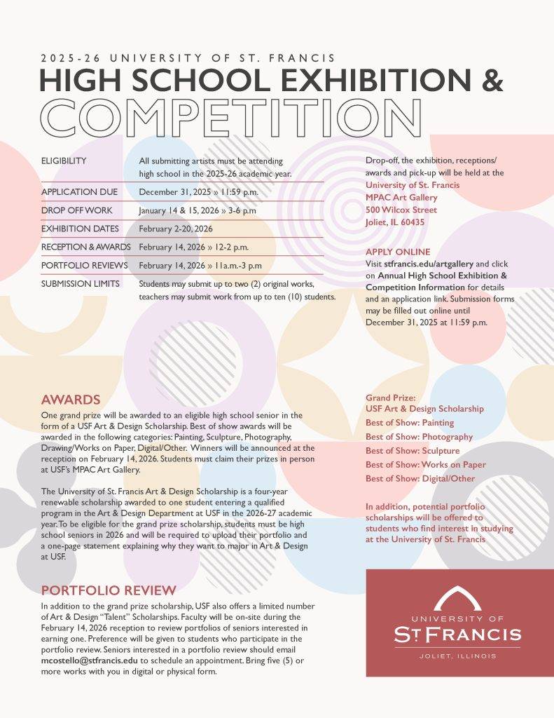 USF Gallery is proud to host the annual St. Francis Student Artist Exhibition. The exhibition is open to all USF students, any major. All are welcome to join us for a light breakfast with USF President Arvid Johnson and College of Arts & Sciences Dean Elizabeth Davies on Thursday, April 2, 2019 at 10:30 a.m. Winners and scholarship awards will be announced at the breakfast